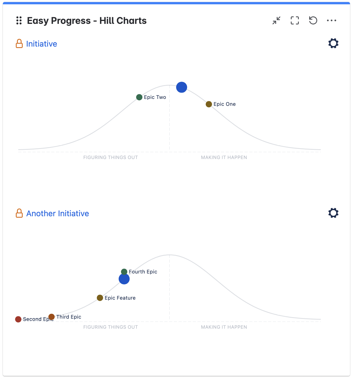 The Easy Progress – Hill Chart for Jira gadget brings your hill charts directly to Jira dashboards. Use it to track progress on key issues (Initiatives, Epics, or Tasks) and their child issues - all in one visual snapshot.