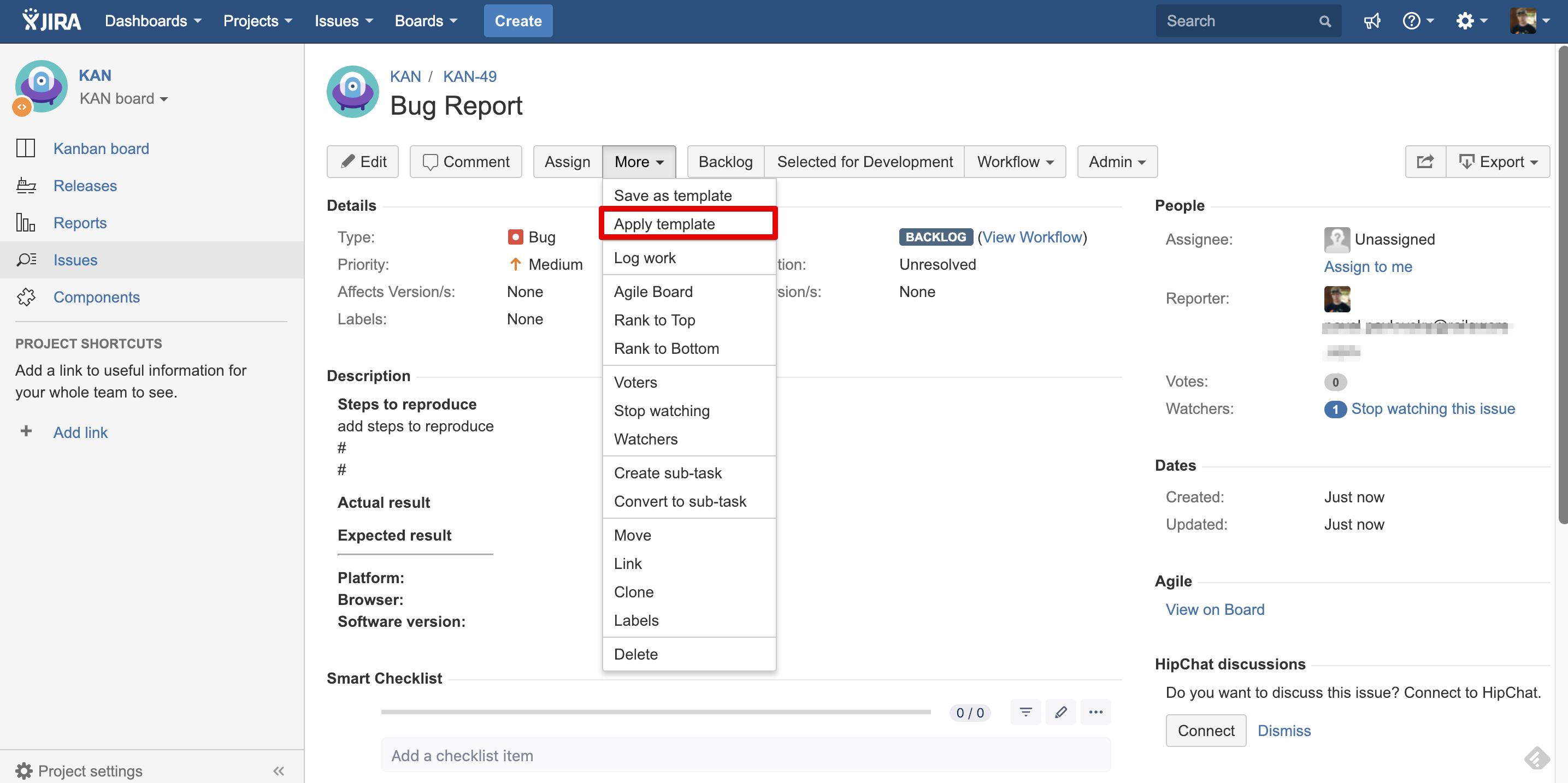 Applying pre-defined templates to existing issues in Jira can significantly streamline your workflow. The Easy Templates for Jira Data Center app simplifies this process, allowing you to quickly update issues with standardized information. Follow these steps to apply a template to an existing issue in Jira Cloud!
